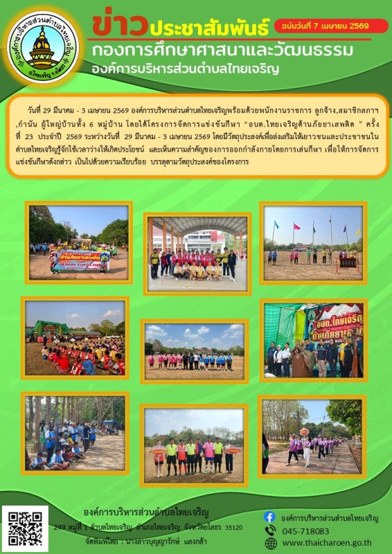 วันที่ 29 มีนาคม - 3 เมษายน 2569 องค์การบริหารส่วนตำบลไทยเจริญพร้อมด้วยพนักงานราชการ ลูกจ้าง,สมาชิกสภาฯ,กำนัน ผู้ใหญ่บ้านทั้ง 6 หมู่บ้าน โดยได้โครงการจัดการแข่งขันกีฬา “อบต.ไทยเจริญต้านภัยยาเสพติด ” ครั้งที่ 23 ประจำปี 2569 ระหว่างวันที่ 29 มีนาคม - 3 เมษายน 2569 โดยมีวัตถุประสงค์เพื่อส่งเสริมให้เยาวชนและประชาชนในตำบลไทยเจริญรู้จักใช้เวลาว่างให้เกิดประโยชน์ และเห็นความสำคัญของการออกกำลังกายโดยการเล่นกีฬา เพื่อให้การจัดการแข่งขันกีฬาดังกล่าว เป็นไปด้วยความเรียบร้อย บรรลุตามวัตถุประสงค์ของโครงการ