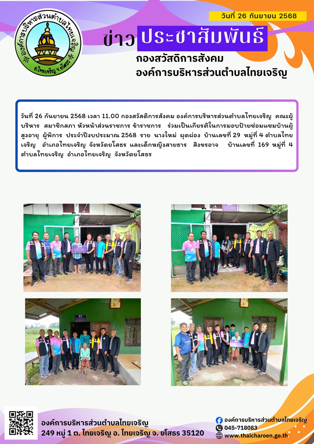 วันที่ 26 กันยายน 2568 เวลา 11.00 กองสวัสดิการสังคม องค์การบริหารส่วนตำบลไทยเจริญ คณะผู้บริหาร สมาชิกสภา หัวหน้าส่วนราชการ ข้าราชการ ร่วมเป็นเกียรติในการมอบป้ายซ่อมแซมบ้านผู้สูงอายุ ผู้พิการ ประจำปีงบประมาณ 2568 ราย นางใหม่ ผุดผ่อง บ้านเลขที่ 29 หมู่ที่ 4 ตำบลไทยเจริญ อำเภอไทยเจริญ จังหวัดยโสธร และเด็กหญิงสายธาร สิงขรอาจ บ้านเลขที่ 169 หมู่ที่ 4 ตำบลไทยเจริญ อำเภอไทยเจริญ จังหวัดยโสธร