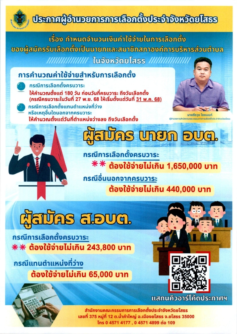 ประกาศ เรื่อง กำหนดจำนวนเงินค่าใช้จ่ายในการเลือกตั้งของผู้สมัครรับเลือกตั้งเป็นนายกและสมาชิกสภาองค์การบริหารส่วนตำบล